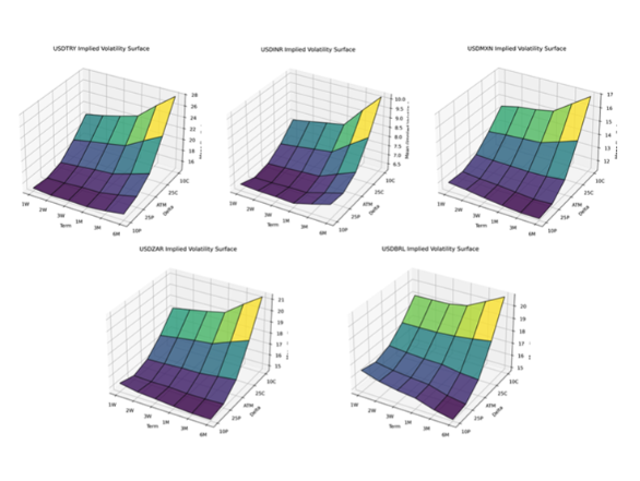 Bu çalışma, beş gelişmekte olan piyasa para biriminin (TRY, INR, MXN, ZAR ve BRL) ABD Doları karşısındaki zımni oynaklık yüzeylerinin modellenmesinde ARIMA, PCA-VAR, PCR ve İleri Beslemeli Sinir Ağları (FNN) dahil olmak üzere zaman serisi ve makine öğrenimi modellerinin tahmin gücünü araştırmayı amaçlamaktadır.